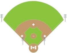 C’est la disposition minimale pour un terrain de baseball / softball. Il faudra penser à équiper des projecteurs très puissants pour couvrir toute la zone de jeu car, avec 4 mâts seulement, certaines parties du terrain risqueraient d’être ombragées et donc la visibilité y serait réduite.