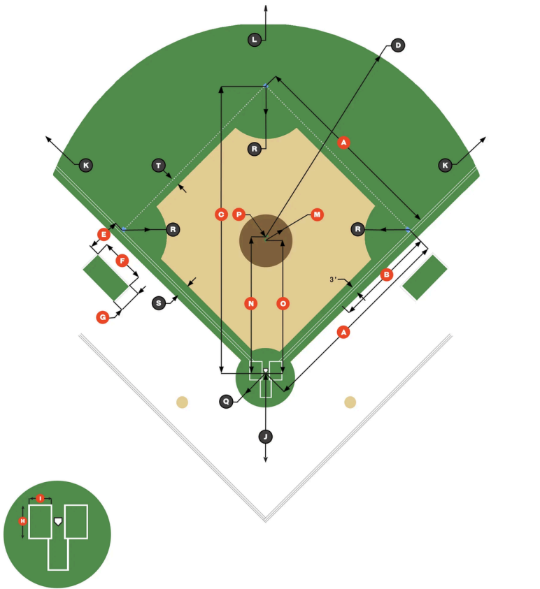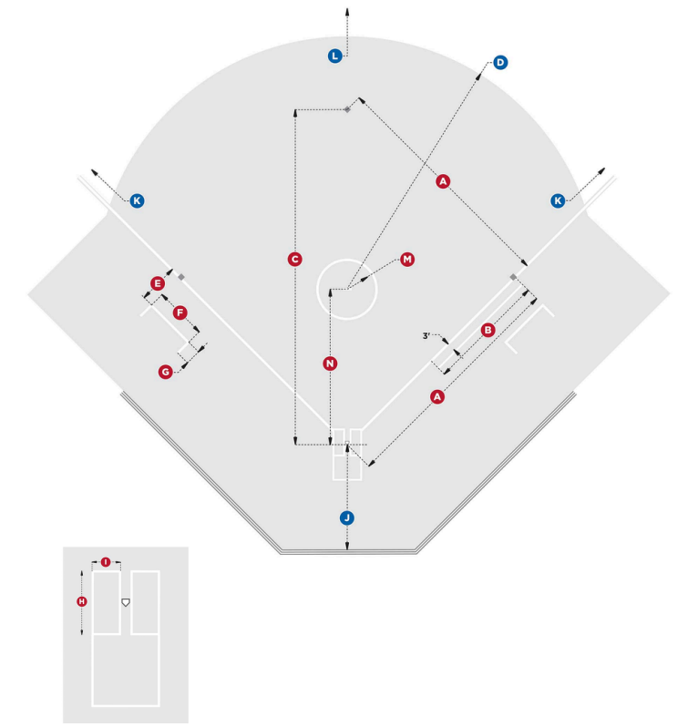 | Distance entre le marbre et la plaque de lanceur | N | 46′ / 14,021 m | |